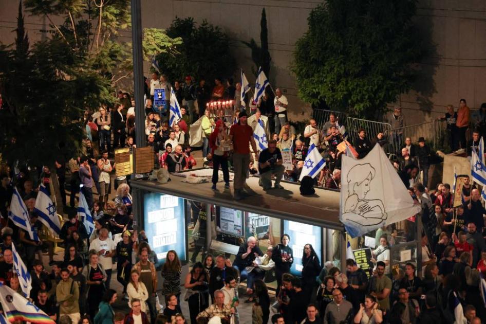 وقال المنظمون إن نحو 100 ألف شخص تجمعوا عند مفترق طرق في تل أبيب أعيد تسميته «ميدان الديمقراطية»، منذ الاحتجاجات الحاشدة ضد التعديلات القضائية المثيرة للجدل العام الماضي.
