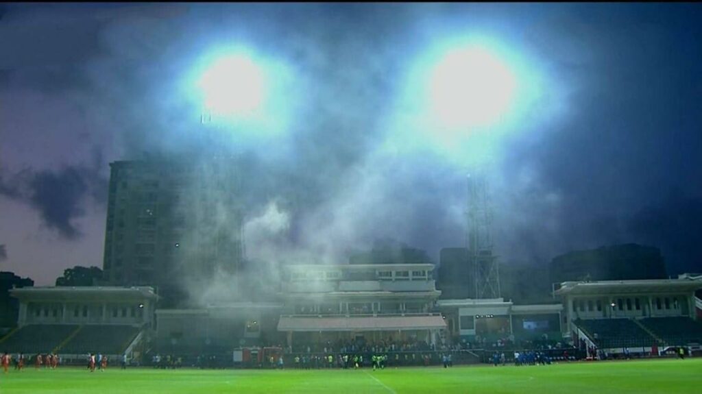 وأثناء لعب المباراة بشكل طبيعي وبالتحديد في الدقيقة 49، تفاجأ الجميع بخروج أدخنة بشكل شديد ودخول سيارات الإطفاء إلى ملعب المباراة، ثم انقطاع الكهرباء، ليكتشف اللاعبون والأجهزة الفنية نشوب حريق ضخم في المقصورة بالملعب.