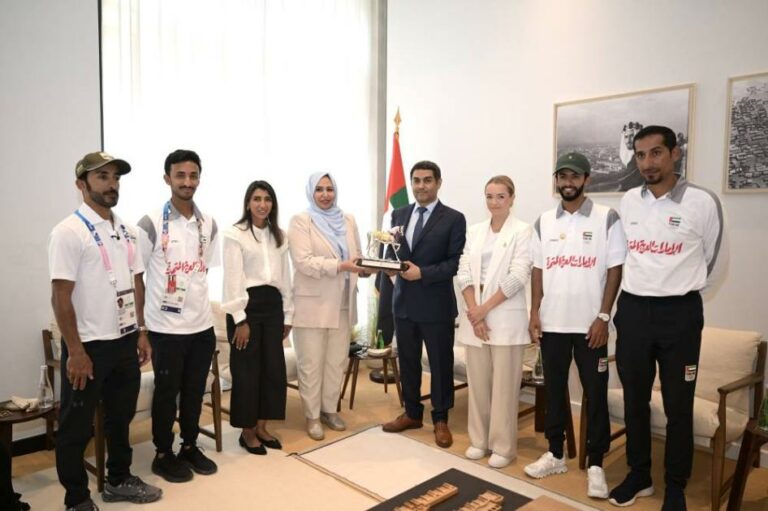 نيابة عن الشيخة فاطمة بنت هزاع آل نهيان رئيس مجلس إدارة أكاديمية فاطمة بنت مبارك للرياضة النسائية، رئيسة نادي أبوظبي للسيدات، ونادي العين للسيدات، مالك ومؤسس اسطبلات الشراع زار محمد أحمد الحربي المدير العام لجمعية الإمارات للخيول العربية، يرافقه منتخبنا الوطني لقفز الحواجز البيت الأولمبي الإماراتي،بحضور أمل بوشلاخ عضو مجلس إدارة اللجنة الأولمبية الوطنية.