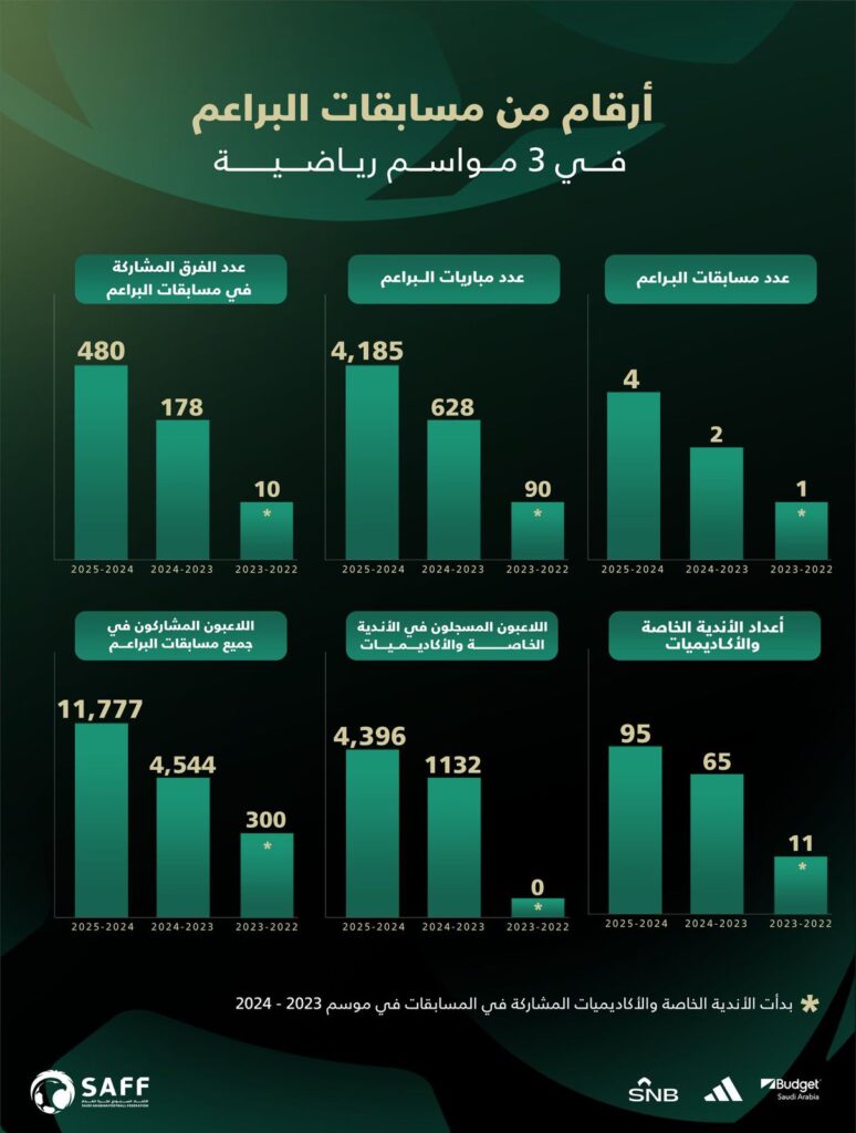 وأكملت الإدارة الفنية خلال عام 2024 عقد تأسيس دوريات البراعم للفئتين العمريتين 12 و14 عامًا لتكون إلى جانب الفئتين 11 و13 عامًا، لتحقق التكامل العمري قبل المشاركة الرسمية للفئة العمرية في دوريات 15 عامًا وهي (الدوري الممتاز – دوري الدرجة الأولى – بطولة أندية المملكة لأندية الدرجة الثانية) حيث يشارك في الدوريات 478 مشتركًا ما بين نادٍ حكومي، أكاديمية خاصة، نادٍ تجاري ومركز تدريب إقليمي.