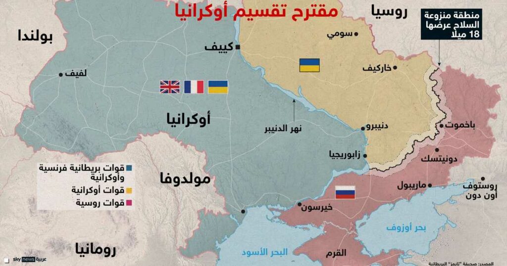 ووفقًا للممثل الخاص لترامب، تسيطر روسيا على شرق أوكرانيا، أي لوغانسك ودونيتسك وزابوريجيا وخيرسون الإضافة إلى شبه جزيرة القرم، وقد تظهر قوات بريطانية وفرنسية في الغرب كجزء من “مهمة ضمان”. في الوقت نفسه، لن ترسل الولايات المتحدة قوات برية، ولكنها قد تشارك في التنسيق.