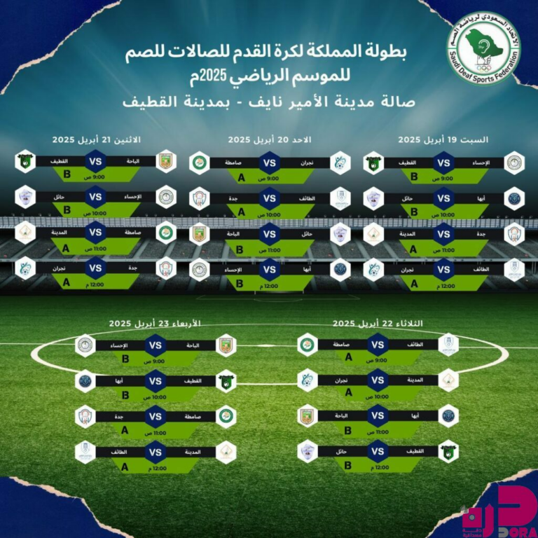 تنطلق صباح غدا السبت منافسات بطولة المملكة لكرة القدم للصالات للصم والتي ينظمها الاتحاد السعودي لرياضة الصم على صالة مدينة الأمير نايف بالقطيف خلال الفترة من 21 إلى 26 شوال الجاري الموافق من 19 إلى 24 أبريل 2025 بمشاركة 10 فرق تم توزيعها على مجموعتين ضمت المجموعة الأولى فرق ” نادي الصم بجدة ،مركز الصم بالطائف , مركز الصم بصامطة ، مركز الصم بنجران ، مركز الصم بالمدينة المنورة ” فيما ضمت المجموعة الثانية فرق ” مركز الصم بالأحساء ، مركز الصم بأبهاء، مركز الصم بالباحة ، مركز الصم بحائل ، مركز الصم بالقطيف ” .