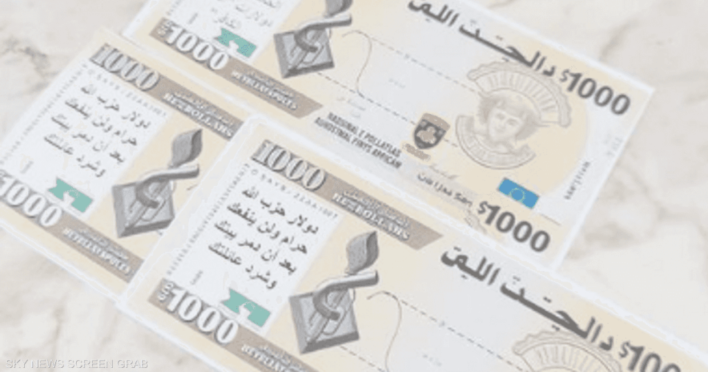 وعلى الطرف الآخر للعملة كتب: “دولار حزب الله حرام، ولن ينفعك بعد أن دمر بيتك وشرد عائلتك”.