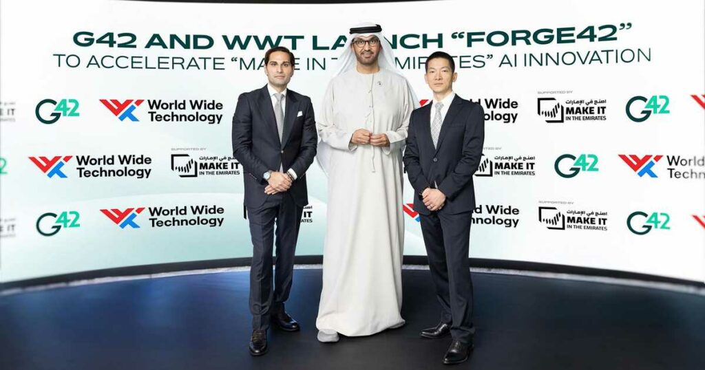 الدكتور سلطان الجابر، وزير الصناعة والتكنولوجيا المتقدمةكشفت مجموعة “جي 42” الإماراتية، وشركة “وورلد وايد تكنولوجي” الأميركية، الأربعاء، عن إطلاق شركة “Forge42”- الشركة الجديدة عالمية المستوى بهدف تعزيز منظومة الابتكار المحلية في مجال الذكاء الاصطناعي.وشهد الدكتور سلطان أحمد الجابر، وزير الصناعة والتكنولوجيا المتقدمة الإماراتي، إطلاق الشركة التي تسعى لتسريع تطوير حلول وأدوات الذكاء الاصطناعي، وذلك على هامش فعاليات الدورة الرابعة من “اصنع في الإمارات” المنعقدة حالياً في مركز أبوظبي الوطني للمعارض “أدنيك”.