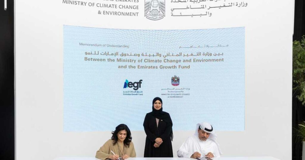 .وقّعت وزارة التغير المناخي والبيئة، وصندوق الإمارات للنمو (EGF) مذكرة تفاهم استراتيجية تهدف إلى دعم نمو الشركات الإماراتية التي تقود حلولاً مبتكرة في مجالات الأمن الغذائي، الزراعة المستدامة، والتكنولوجيا البيئية.وجرى توقيع الاتفاقية ضمن فعاليات النسخة الأولى من المؤتمر والمعرض الزراعي الإماراتي في مدينة العين، بحضور الدكتورة آمنة بنت عبدالله الضحاك، وزيرة التغير المناخي والبيئة الإماراتية، ونجلاء المدفع، نائب رئيس مجلس الإدارة والعضو المنتدب لصندوق الإمارات للنمو.