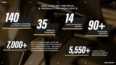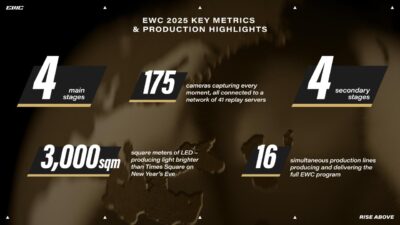 وتقدّم البطولة هذا العام أكثر من 7,000 ساعة من المحتوى على مدار سبعة أسابيع خلال الفترة من 7 يوليو إلى 24 أغسطس 2025، وذلك انطلاقًا من أربع ساحات رئيسة، و26 استوديو متخصصًا، بإشراف طاقم دولي يضم أكثر من 550 محترفًا، ضمن تجربة إعلامية تعد الأكبر في تاريخ الرياضات الإلكترونية، والثانية على مستوى الأحداث الرياضية العالمية، بما يعكس التزام المملكة بتطوير منظومة الألعاب والرياضات الإلكترونية وتحقيق الريادة فيها على مستوى العالم.