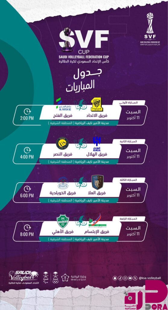 تنطلق غداً (السبت) مواجهات دور ربع النهائي في بطولة كأس الاتحاد السعودي لكرة الطائرة في نسختها الـ35، وذلك على صالة مدينة الأمير نايف الرياضية بالقطيف.