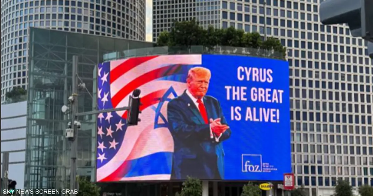 إحدى هذه اللوحات كتب عليها إلى جانب صورة ترامب والعلمين الإسرائيلي والأميركي: “كورش الكبير على قيد الحياة”.