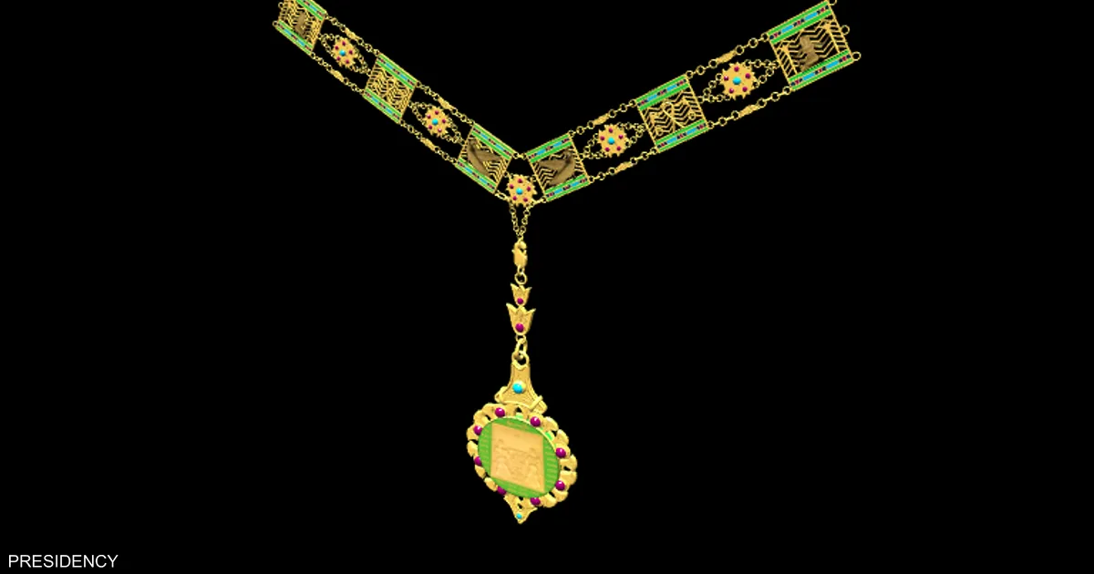 وتتوسط القلادة حلية دائرية تمثل رمز النيل الموحد بين الشمال والجنوب، حيث يرمز البردي للشمال واللوتس للجنوب، في دلالة على وحدة مصر منذ آلاف السنين.