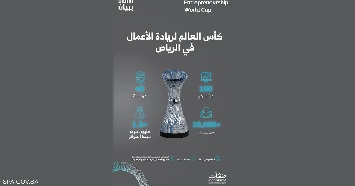 وتعد مسابقة كأس العالم لريادة الأعمال أكبر مسابقة عالمية لرواد الأعمال، والتي تقام بتنظيم من “منشآت”، بالتعاون مع الشبكة العالمية لريادة الأعمال (GEN) ومؤسسة محمد بن سلمان “مسك”، حيث يتنافس المشاركون على جوائز مالية تتجاوز قيمتها (1.5) مليون دولار، في حدث يجمع نخبة من رواد الأعمال والمستثمرين والخبراء العالميين، ويُبرز مكانة المملكة المتنامية مركزًا عالميًا لريادة الأعمال والابتكار.