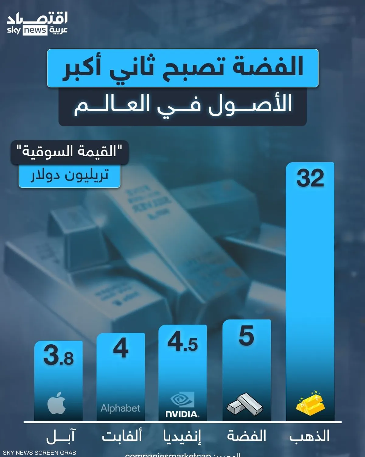 الفضة تتفوق على إنفيديا وتصبح ثاني أعلى الأصول قيمة بعد الذهب بقيمة سوقية تتجاوز 5 تريليونات دولار