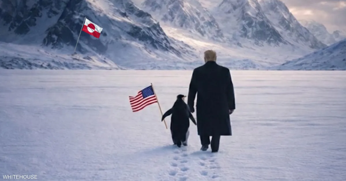 وتظهر الصورة ترامب وهو يسير على أرض جليدية برفقة بطريق مع خلفية من صور غرينلاند.