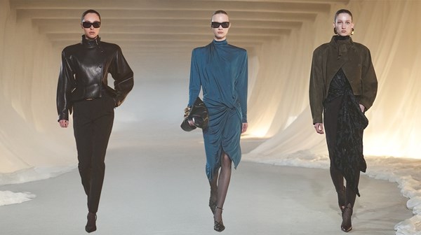 أعاد معطف «الترنش»، بقصته الهندسية الصارمة، صياغة كاريزما نجم السينما الأميركي همفري بوغارت، مانحاً الإطلالات هيبة صارمة مغلفة بالأنوثة. كما اهتم بتفاصيل فساتين السهرة، التي كانت تعبر دائما عن نموذج «المرأة الفاتنة»، من خلال الخطوط الطويلة، والانسدالات الناعمة، بالإضافة إلى ظهور نقشة «الأنيملير» المرتبطة تاريخياً بالدار عبر تطريز بحبات «الكافيار»، التي تعكس الضوء بوميض خافت. كما تألقت العارضات بمعطف أسود مغطى بالكامل بريش مصنوع يدوياً من الجلد، وهو أيضاً من علامات «بالمان» التاريخية.