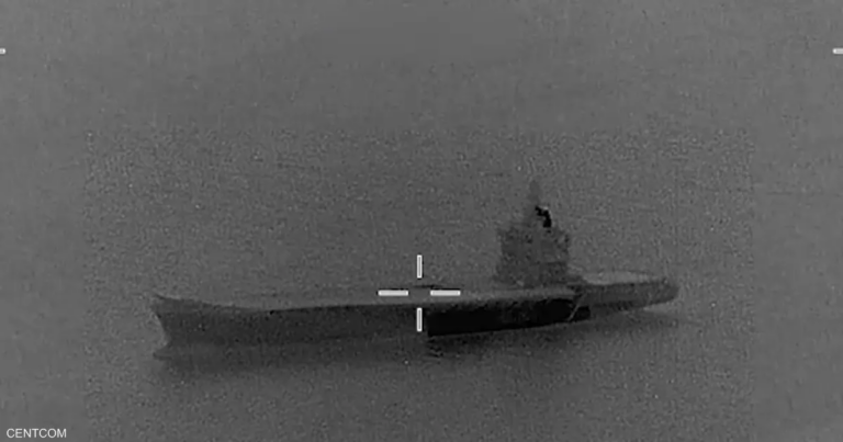 وأظهرت رسالة صادرة عن القيادة المركزية للجيش الأميركي لقطات بالأبيض والأسود للحاملة وهي تشتعل فيها النيران بعد تعرضها لضربات متعددة.