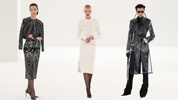 كما ظهر خيط أكثر جرأة، عبر إدخال البلاستيك الشفاف كمادة غير متوقعة، جرى الارتقاء بها من خلال التنسيقات، حيث نُفذت بأنماط عديدة، مثل: بليزر قصير، ومعطف ترنش، وحتى وشاح على طراز بابوشكا من خامات اصطناعية شفافة.