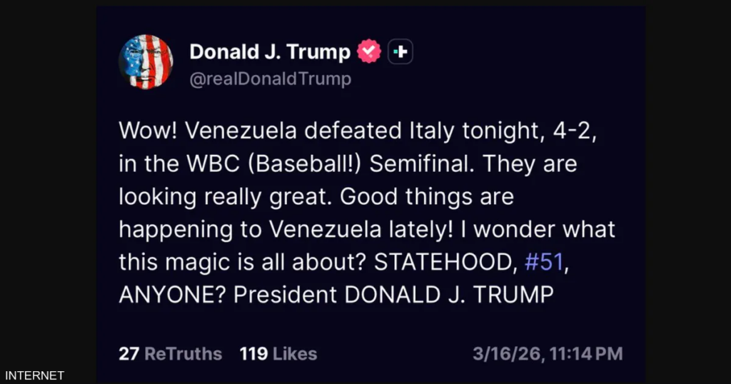زاد الرئيس الأميركي دونالد ترامب، الذي ألقت حكومته القبض على الرئيس الفنزويلي نيكولاس مادورو في عملية عسكرية في يناير الماضي، من حدة التوتر بمنشور على وسائل التواصل الاجتماعي يوم الاثنين، هنأ فيه فنزويلا على بلوغها المباراة النهائية، ملمحا في الوقت نفسه إلى إمكانية انضمامها إلى الولايات المتحدة لتصبح “الولاية رقم 51”.