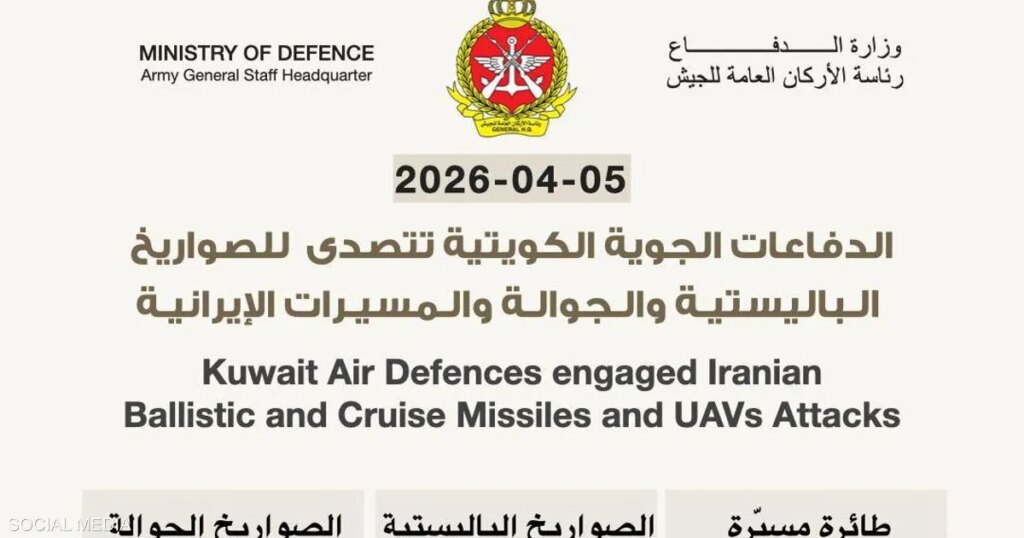 أعلن الجيش الكويتي أن قواته المسلحة رصدت وتعاملت خلال الـ24 ساعة الماضية مع 9 صواريخ باليستية، و4 صواريخ جوالة، و31 طائرة مسيّرة معادية اخترقت المجال الجوي الكويتي، حيث تم اعتراضها والتعامل معها وفق الإجراءات العسكرية المعتمدة.