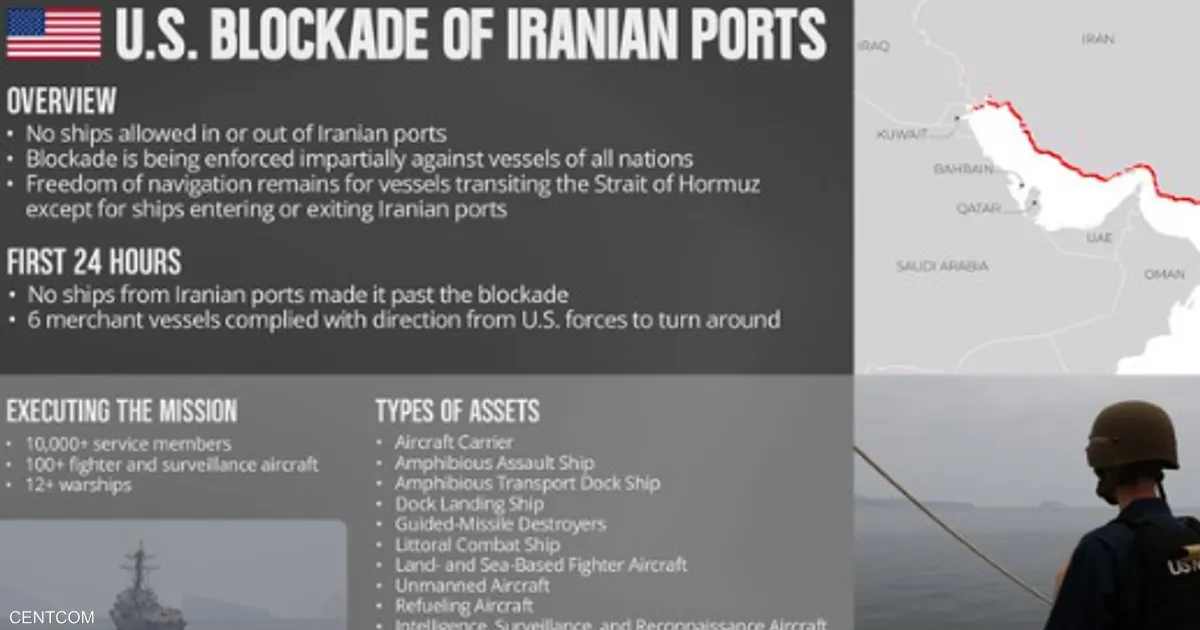 وشددت واشنطن على أن الحصار يطبق “بشكل محايد” ليشمل كافة السفن بغض النظر عن جنسيتها أو العلم الذي ترفعه، طالما كانت وجهتها الموانئ الإيرانية في الخليج العربي أو خليج عمان.