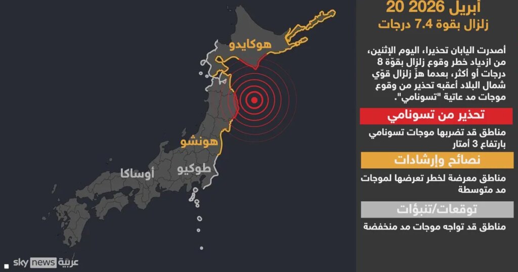 وكانت موجة تسونامي بارتفاع 80 سنتيمترا ضربت، في وقت سابق اليوم الإثنين، شمال اليابان، بعد زلزال قوي بلغت شدته 7.4 درجات، وفق ما أعلنت الأرصاد الجوية اليابانية.