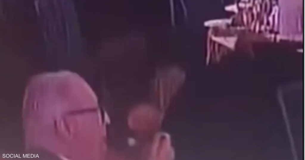 وأظهرت لقطات الفيديو، الرجل جالسا في مكانه، ومستمرا في العشاء، بينما سارع الحضور إلى الاختباء تحت الطاولات أو الركض باتجاه المخارج الآمنة.