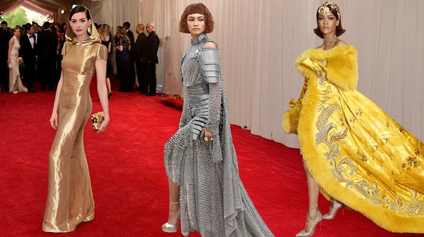 أبهرت النجمة ريهانا العالم بفستان أصفر ضخم، مزين بتطريزات ذهبية مع ذيل طويل جداً، حمل توقيع المصممة الصينية غو بي، واستغرق سنوات من العمل اليدوي الدقيق. وكانت هذه الإطلالة معبرة بصدق عن موضوع المعرض آنذاك «الصين: عبر المرآة»، حيث كانت بمثابة احتفاء مهيب بالثقافة الصينية، وتحولت بعد العرض مباشرة إلى واحدة من أكثر الإطلالات تداولاً وتأثيراً في تاريخ الإنترنت.