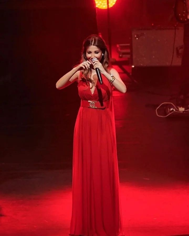 واختارت النجمة اللبنانية لهذه المناسبة فستاناً طويلاً باللون الأحمر دون أكمام، لكنه مزودٌ بكابٍ وحزامٍ باللون ذاته، وتميز بقصة (V)، من توقيع المصمم اللبناني العالمي إيلي صعب لمجموعة ربيع وصيف 2022.