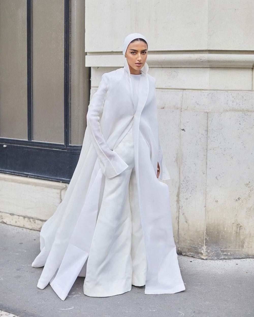 واحتفالاً بعرض أزياء المصمم السعودي العالمي محمد آشي، ظهرت يارا النملة متألقة بالأبيض بالكامل بإطلالة من توقيع Ashi tudio، مكونة من معطف أبيض طويل ذي تفاصيل ناعمة على الكمين وقميص وبنطلون ذي قصة واسعة (Flare Cut).