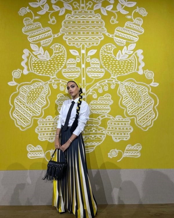 ووفقاً لآخرة صيحات الموضة، ظهرت خبيرة الجمال والموضة بإطلالة خارجة عن المألوف تماماً، حيث نسقت قميصاً باللون الأبيض مع تنورة بيليسيه، تجمع بين الألوان: الأسود والأصفر والأبيض، وحجاباً غير تقليدي بشكل ضفيرة طويلة مجدولة، وحملت الإطلالة توقيع دار الأزياء العالمية Dior.
