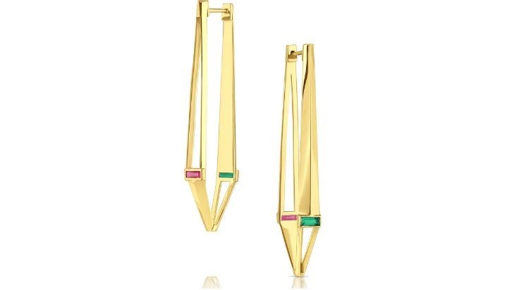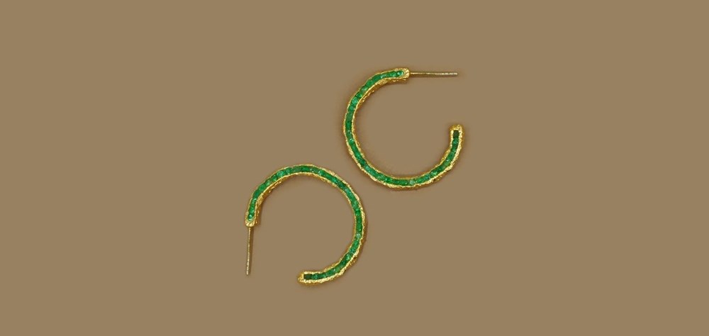 هذه الأقراط المصنوعة يدوياً تدور حول صورة ظلية مذهلة، ويتم إنشاء الأطواق بشكل فردي بحيث يختلف كل جانب من نفس الزوج قليلاً عن الجانب الآخر، وتزين بتفاصيل ذهبية ذات حواف يدوية، ثم يتم وضع الزمرد بعناية في الأقراط، واحداً تلو الآخر.