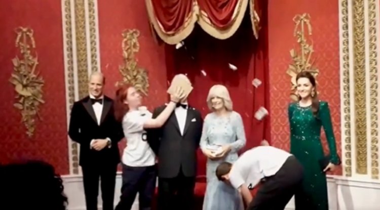 أقدم ناشطو المناخ من مجموعة “Just Stop Oil” على صفع تمثال الملك تشارلز الثالث في متحف Madame Tussauds، بقالب من الحلوى.
