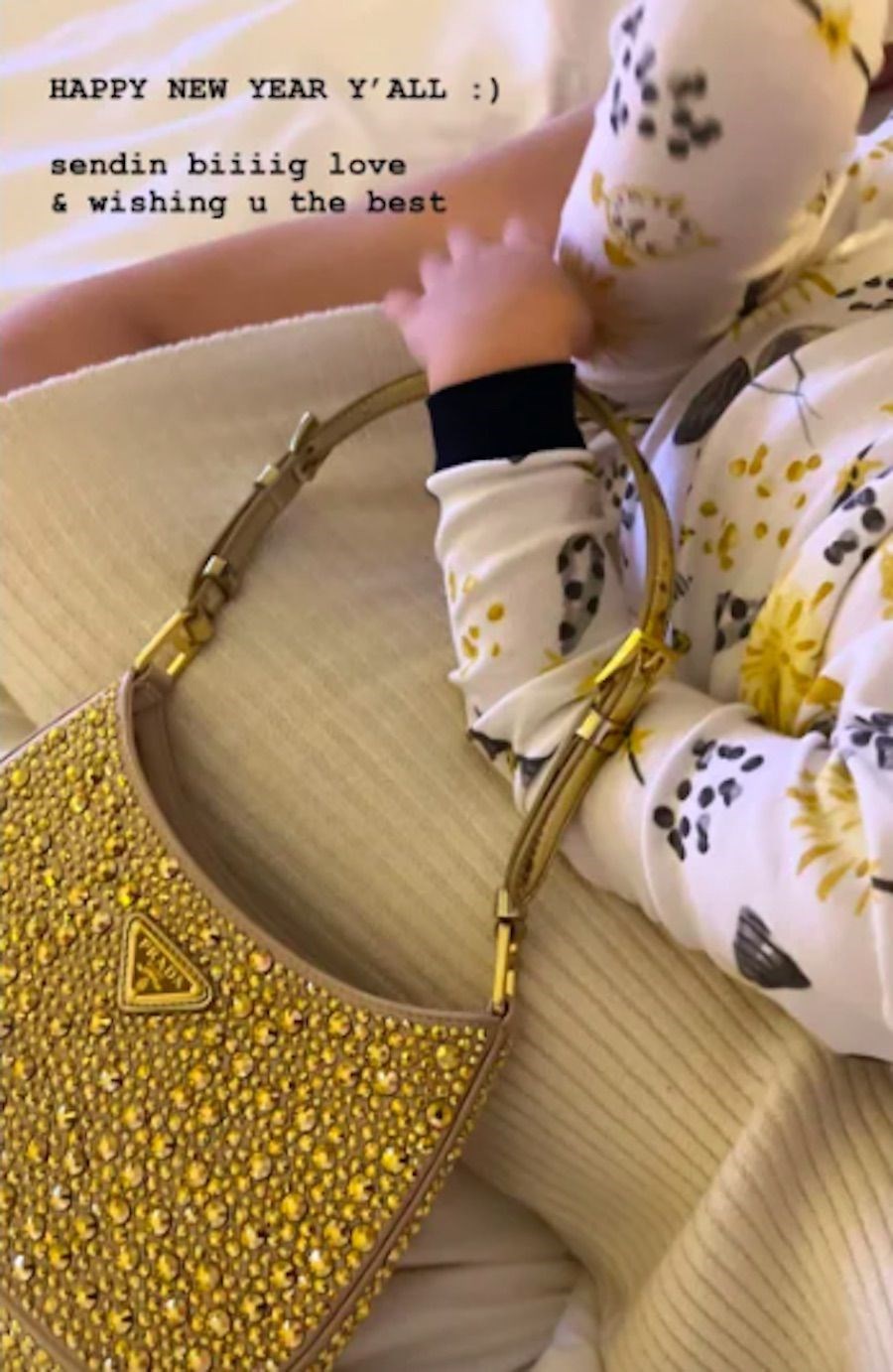 ورغم أن حديد لم تُظهر وجه الطفلة كعادتها، فإنها أعطت جمهورها لمحةً عن الأزياء التي اختارتها لها، حيث أطلت الطفلة مرتديةً بيجاما بيضاء، تزينت بطبعاتٍ سوداء وذهبية، بينما تحمل في يدها حقيبةً صغيرة باللون الذهبي من توقيع دار الأزياء الإيطالية الفاخرة “برادا”، مزينة بالكريستال، ويبلغ ثمنها 3700 دولار.