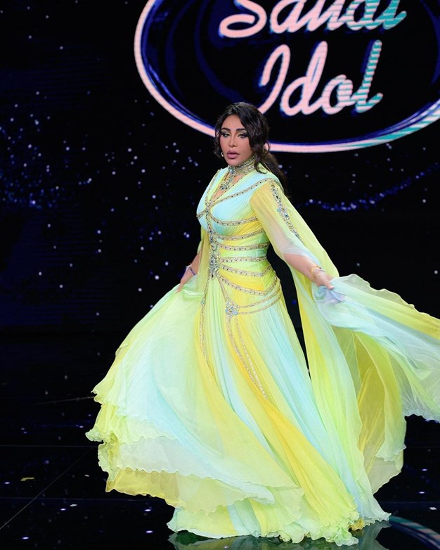 في نهاية برنامج “سعودي آيدول”، تألقت الفنانة الإماراتية أحلام بإطلالة مبهجة وصيفية، حيث اختارت فستاناً باللون الأصفر من توقيع المصمم اللبناني زهير مراد، حيث طغى على الفستان التصميم الواسع بالتطريزات المرصعة بالمجوهرات والأحجار الملونة، التي جاءت على هيئة عقود كبيرة الحجم.