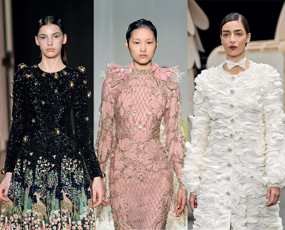 ولى زمن أن يكتفي المصممون بالمخمل والحرير، وأصبح السائد الآن الخروج على الملمس البسيط والإقبال بشراهة على المزيد من التنوع والتعقيد. فعلى سبيل المثال، اختارت Virginie Viard المديرة الإبداعية لدار Chanel تزيين فساتينها بمويجات عبارة عن طبقات بارزة من الأقمشة، في حين آثر المصمم اللبناني رامي قاضي رقياً بإيقاع أهدأ وأنعم، عندما مزج بين نوعين من الأقمشة أحدهما مطرز بخيوط تشبه المتاهة، أما المصمم الهندي Rahul Mishra فأدهشنا بجعل مجموعة من حشرة الدعسوقة ذهبية اللون تتسلق فساتينه وكأنها تهرب من حديقته الغناء المطرزة تطريزاً بارزاً تكاد ألوانه تنبض بالحياة.