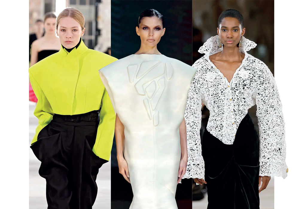 ولأن تاريخ الموضة يكرر ذاته، تطل علينا في الموسم الحالي ملامح استعارها المصممون من حقبة الثمانينيات من القرن الماضي، أهمها الأكتاف العريضة المبطنة، والأكمام الطويلة الواسعة، والياقة العالية، والبذلات الموحية بالقوة والسيطرة والتي تفرض بها الأنثى حضورها فرضاً معززاً لثقتها الذاتية. الأكتاف العريضة بجرأتها الطاغية بدت تجتاح فساتين السهرات والسترات القصيرة وحتى البلوزات، وهي تمنح للجسم صورة ظلية مغايرة لنمط A-Line الكلاسيكي. اجمعي بين القصات ذات الخطوط القوية والألوان اللافتة خاصة وإن كانت فسفورية مشرقة.