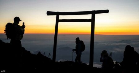 سياح يشاهدون شروق الشمس من فوق قمة جبل فوجيتسبب القلق من احتمال حدوث زلزال ضخم في اليابان بإلغاء الآلاف من حجوزات الفنادق في المناطق التي تعتبر…