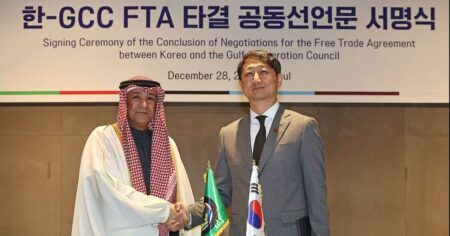وزير التجارة الكوري الجنوبي وأمين عام مجلس التعاون الخليجيوقع مجلس التعاون الخليجي على اتفاقية تجارة حرة مع كوريا الجنوبية، في خطوة من المتوقع أن تعزز القدرة…